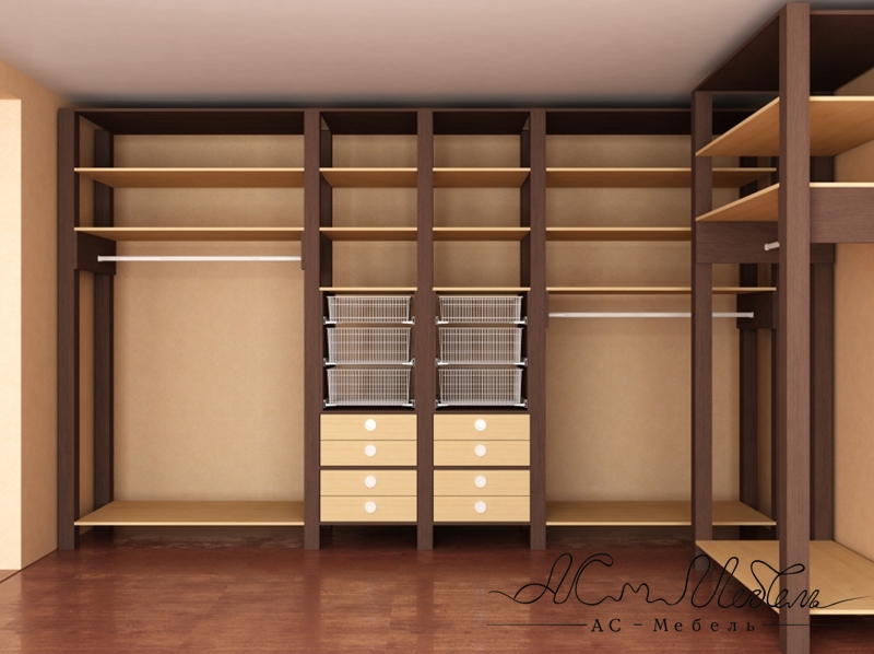 Гардеробная может комплектоваться специальными сетчатыми корзины и ящики, в которых хорошо хранить трикотажное белье, так как вещи в них дышат. Для брюк можно вмонтировать специальную вешалку карусель.