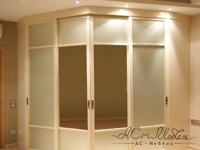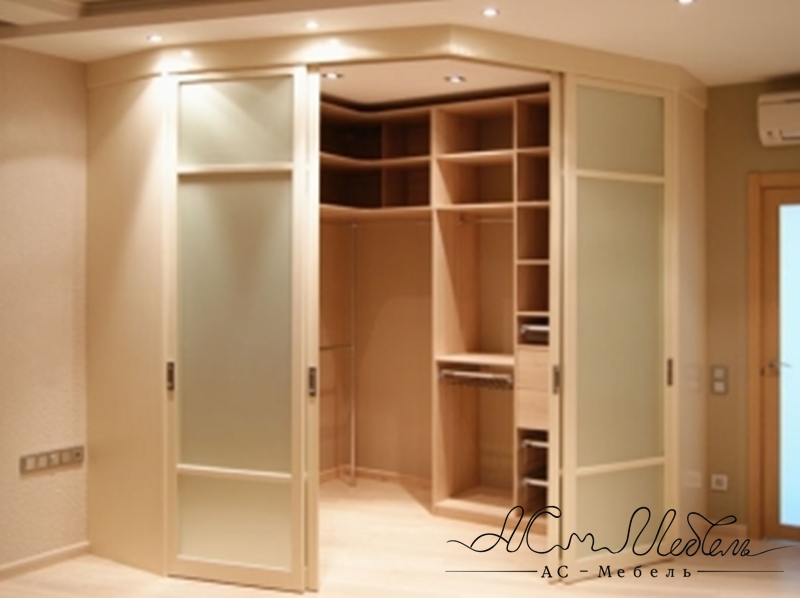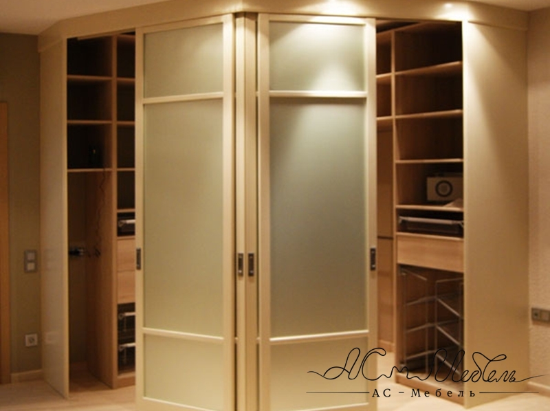 Угловая гардеробная комната с дверьми купе.