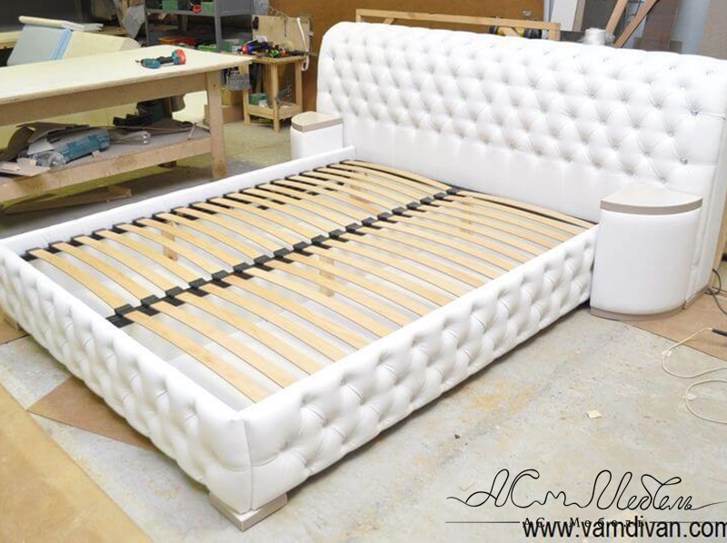 Кровать с банкеткой в спальню на заказ с каретной стяжкой. Кровать с широким изголовьем с прикроватными пуфиками с пуговицами. Изготовление двуспальных широких кроватей с каретной стяжкой и пуговицами в кожзаме, коже или ткани. В комплекте треугольные прикроватные пуфы с капитоне и полукруглый большой пуф с нишей внутри.  Широкое изголовье кровати увеличивает пространство спальни.