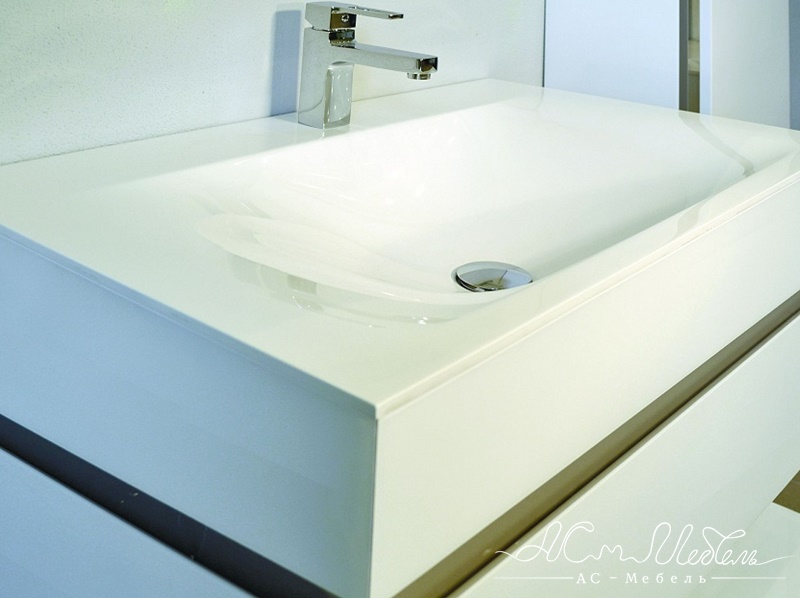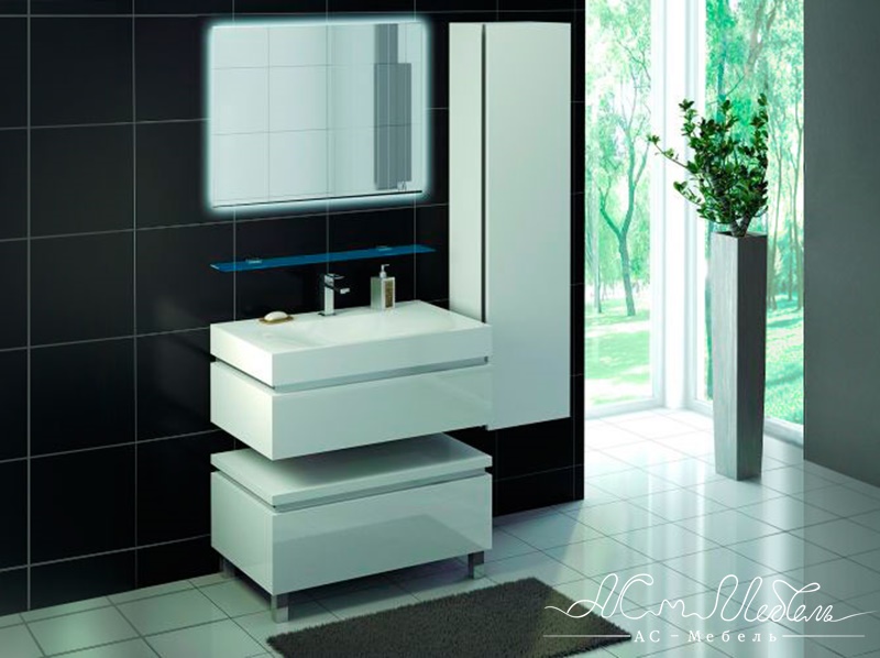Тумбы нижняя устанавливаются на ножки, навесная тумба крепится на кронштейны. Внешние ящики установлены на направляющие нижнего крепежа, обеспечивающие жесткое и надежное крепление и плавный ход. В направляющие встроены доводчики. Настенный пенал-шкаф имеет несколько вместительных полок. Может крепится как с правой, так и с левой стороны.