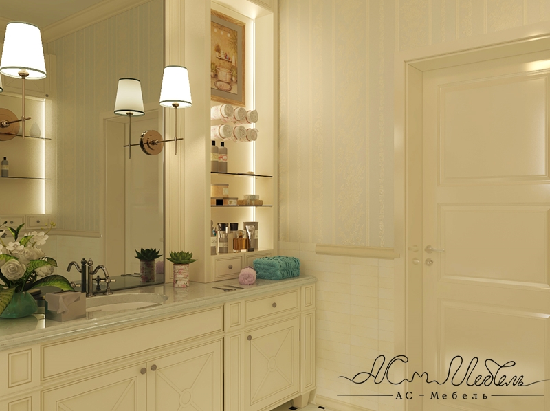 При изготовлении изделий этой коллекции используются натуральные материалы – шпон и массив. Тумба комплектуется столешницей из натурального камня и  раковиной из сан фаянса (мрамора). Гарнитур характеризуются изящными формами, глубокой чашей и широкой поверхностью. Тумба очень функциональна с точки зрения организации внутреннего пространства. Два небольших выдвижных ящика под раковиной вместят в себя множество мелочей. Их плавное движение осуществляется за счет направляющих скрытого монтажа итальянского производства. Вещи большего размера можно спрятать за любым из четырех фасадов. Для открывания створок в изделиях этой коллекции применяются петли с интегрированной системой плавного закрывания от ведущего европейского производителя - компании Blum. Ручки изготовлены из специального сплава, благодаря чему они устойчивы к истиранию и влаге. Большое зеркало подсвечено двумя изящными бра, которые наполняют помещение теплом. Кроме тумб и зеркал в модели ACM-M.015 имеется небольшой стеллаж со стеклянными полками и небольшими ящиками под мелкие штучки.