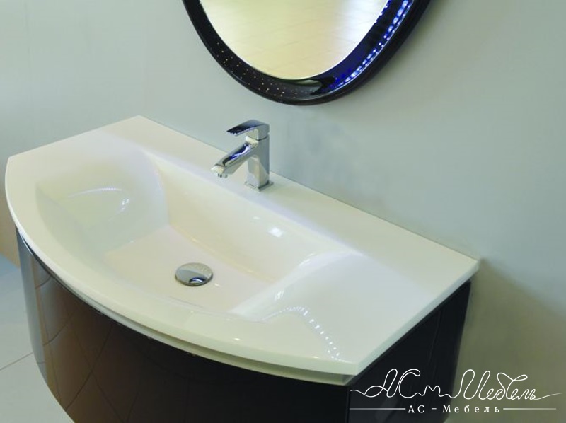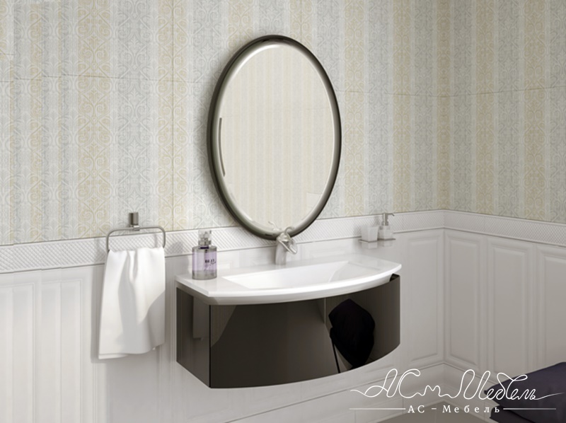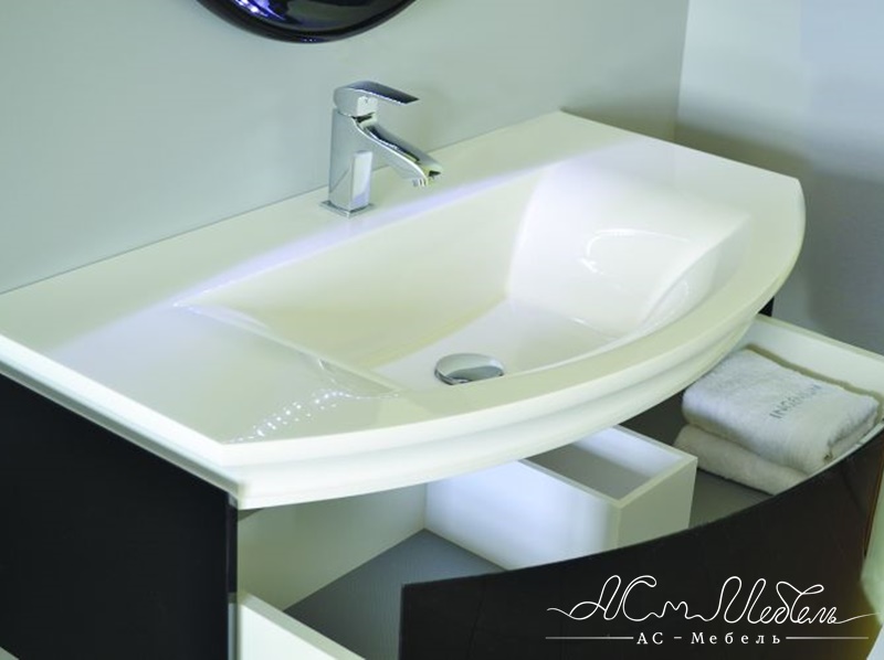 В тумбе за изогнутым овальным фасадом расположен ящик с системой организации пространства, изготовленный из декоративной влагостойкой ДСП. Ящик установлен на направляющие полного выдвижения, благодаря чему им удобно пользоваться даже с керамической раковиной, выступающей вперед. Зеркало выполнено в популярном стиле минимализма - овал, обрамленный пластиком в цвет тумбы, не занимает много места.