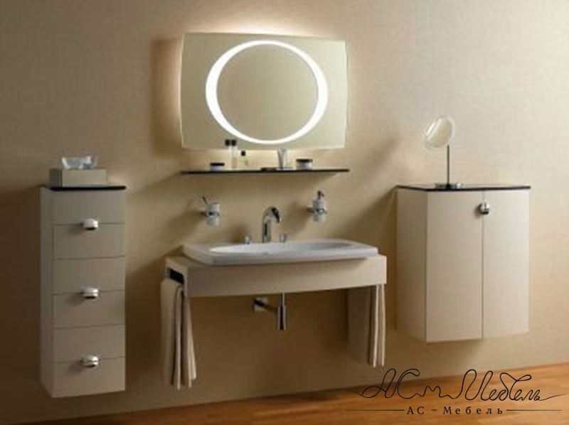 Центром комплекта является широкая раковина из сан фаянса. Ее основные характеристики: большая и глубокая чаша, крыло, на котором можно разложить полезные мелочи, а также с двух сторон декоративный хромированный рейлинг, который можно использовать в качестве полотенцедержателя. Стильное зеркало оснащено дополнительной подсветкой. Два глубоких комода со стеклянной столешницей и распашными фасадами  и выдвижными ящиками отлично дополняют комплект.