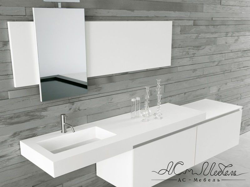 Ядром комплекта является раковина. Ее основные характеристики: большая и глубокая чаша, крыло, на котором можно разложить полезные мелочи. Зеркало с декоративным оформлением, располагается над раковиной. Асимметрично установлены два вместительных ящика с системой "Push"
