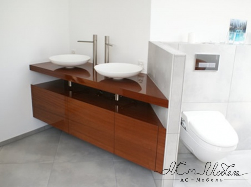 Угловая модель для нестандартных ванных комнат на две удобные раковины. Столешница тумбы изготовлена из декоративного камня, фасады - МДФ с текстурой дерева.