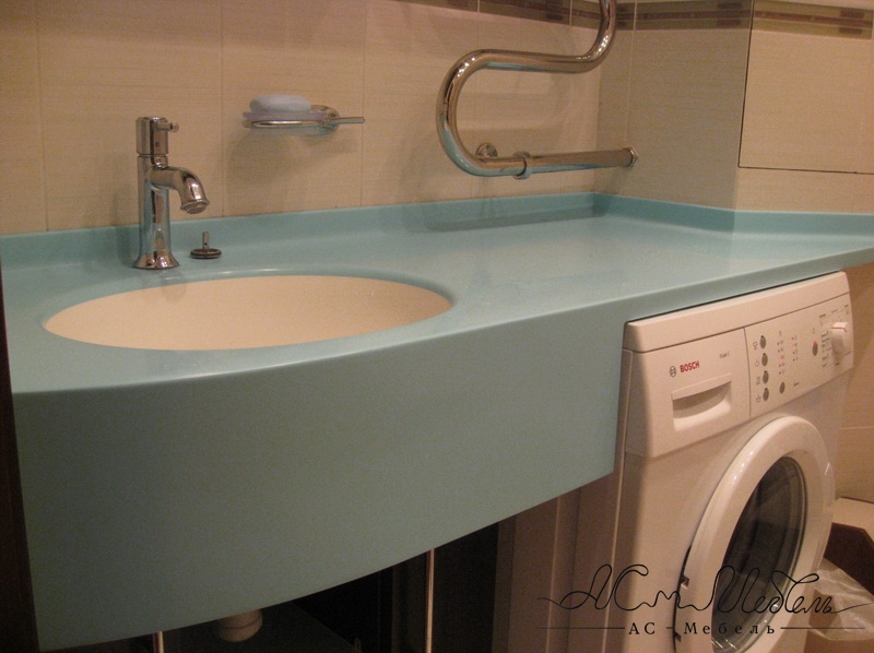 Столешница изготовлена из камня, предназначенных для ванных комнат. Изделия из акрила не боятся сложных условий с повышенной влажностью и не теряют свойств даже по прошествии многих лет использования.