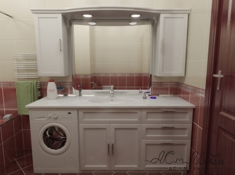 Комфортный и функциональный гарнитур белого цвета. Идеально подойдет для небольших ванных комнат. Функциональность тумбы очевидна - заполнение пространства от пола до столешницы. Наличие небольших и глубоких выдвижных ящиков, полок с распашными фасадами позволяет хозяйка разместить все банные пренадлежности и хоз.средства. Надежная фурнитура позволит  прослужить гарнитуру долгие годы. Широкое зеркало с дополнительной подсветкой и боковыми шкафчиками так же будет радовать вас своим комфортом и рациональностью.