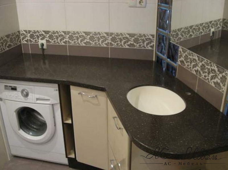 Данная модель используется для небольших ванных комнат. Вместительна, функциональна. Цветовая гамма выполнена в спокойных шоколадно-бежевых тонах. Столешница изготовлена из натурального камня, со встроенной раковиной из сан фаянса классической овальной формы. Под столешницей расположена встроенная бельевая корзина, два выдвижных ящика и открытые угловые полки. Идеальный эконом-вариант.