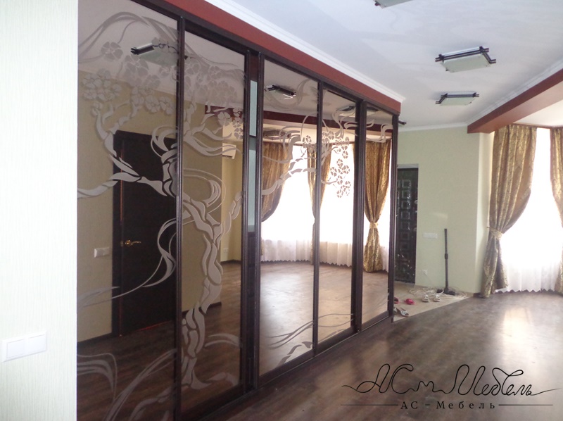 Наполнение дверей: зеркало с пескоструйным рисунком, стекло лакобель, стекло тонированное