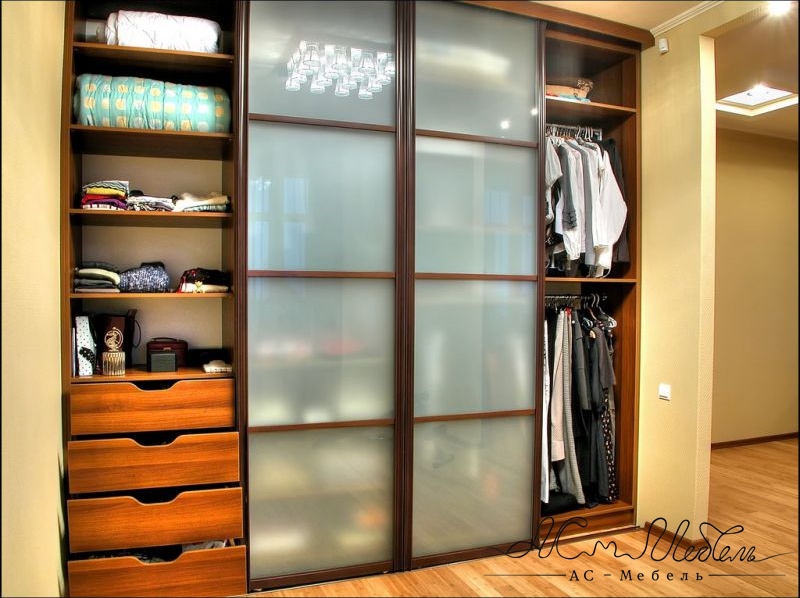 Корпусный шкаф-купе ACM-ShK.028 представлен довольно классическими формами. Однотонное матовое стекло без лишних рисунков и узоров разделено продольными и поперечными вставками темно-коричневого цвета. За дверцами скрывается достаточно места для размещения вещей.