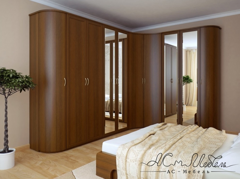 Большой угловой распашной шкаф купе в спальню. Угловая секция и консоли закрыты радиусными дверями. 4 зеркальные двери.
