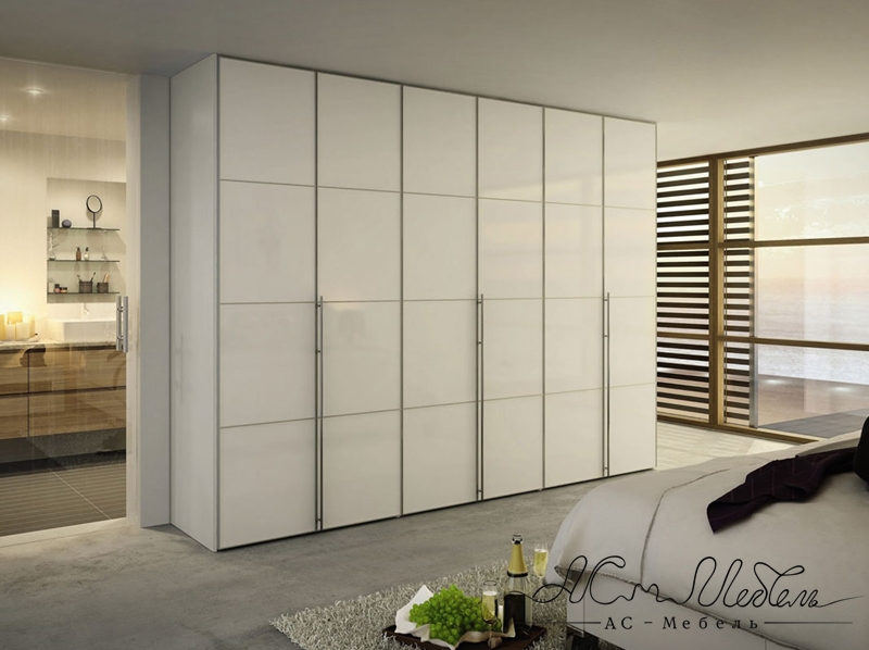Высокий распашной шкаф в спальню белого цвета встроенный. Три секции и шесть распашных дверей.
