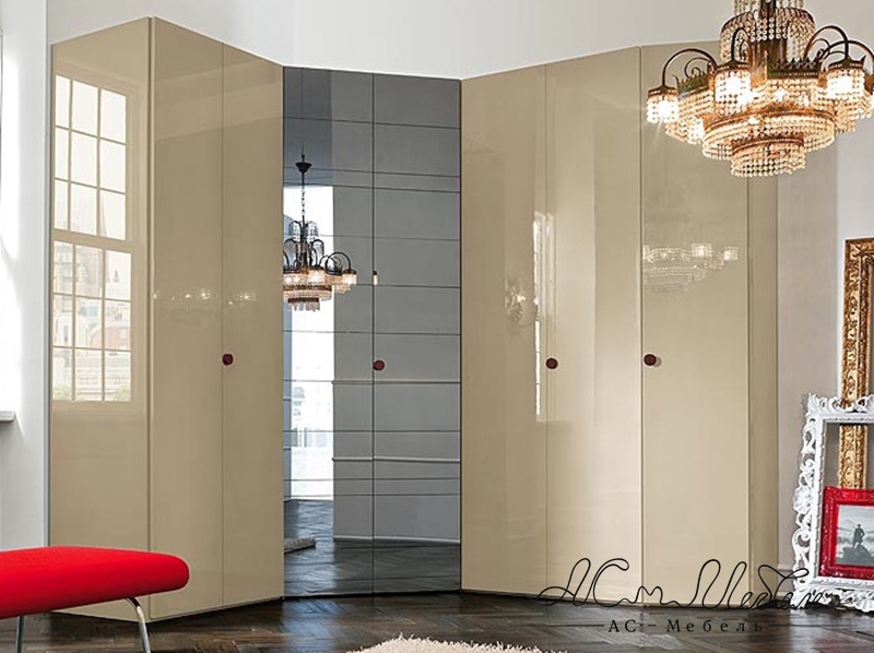Шкаф угловой глянец бежевый состоит из центрального пятистенка с зеркальными распашными дверями по бокам которого пристыкованы прямые распашные шкафы. С правой стороны установлена скошенная секция с полками.