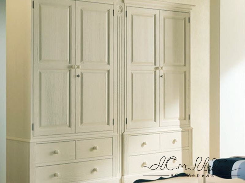 Белый распашной шкаф купе в классическом стиле с выдвижными ящиками. Резные элементы и фрезы на выбор.