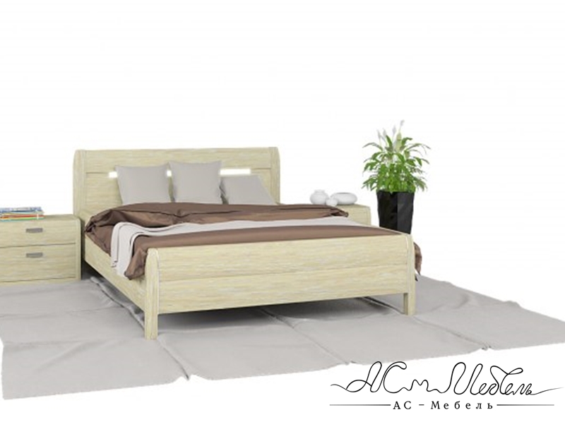 Спальня ACM-S.027 предназначена для сна и отдыха. Кровать состоит из спинки изголовья и основания. Спинка изголовья представляет собой конструкцию в сборе из панелей ЛДСтП толщиной 28 мм и закрепленными сверху декоративными профилями МДФ, вставками ХДФ, полосами матового оргстекла, декоративными деревянными ножками. За полосами матового оргстекла расположены две люминесцентные лампы. Тумбы предназначены для хранения вещей и предметов. Каждая тумба представляет собой каркас из ЛДСтП толщиной 16 мм с закруглёнными в верхней части боковыми стенками из ЛДСтП толщиной 32 мм. Тумбы оснащены двумя выдвижными ящиками с фурнитурой плавного бесшумного закрывания.